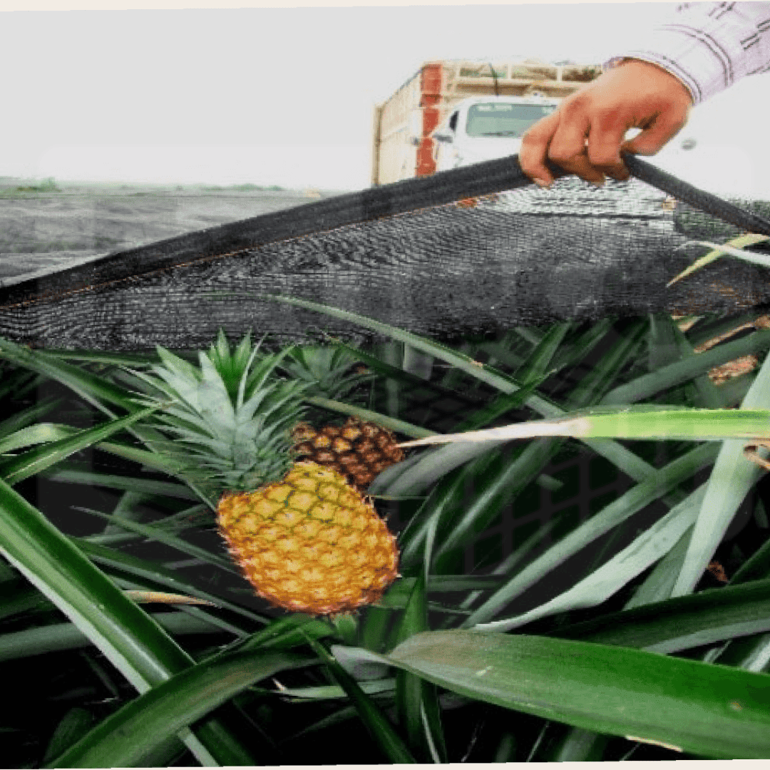 La malla hibrida protege y evita daños por estrés térmico comúnmente utilizada en plantaciones frutales en piso como la piña. Su tejido tipo gasa envuelta permite el flujo de aire y protege al cultivo de los rayos solares. Se confeccionan medidas especiales.